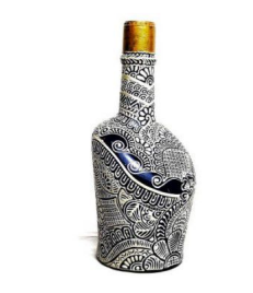 Material used- Glass bottle , Black , White and Golden Highlighters, Stones, Acrylic Colour , Varnished